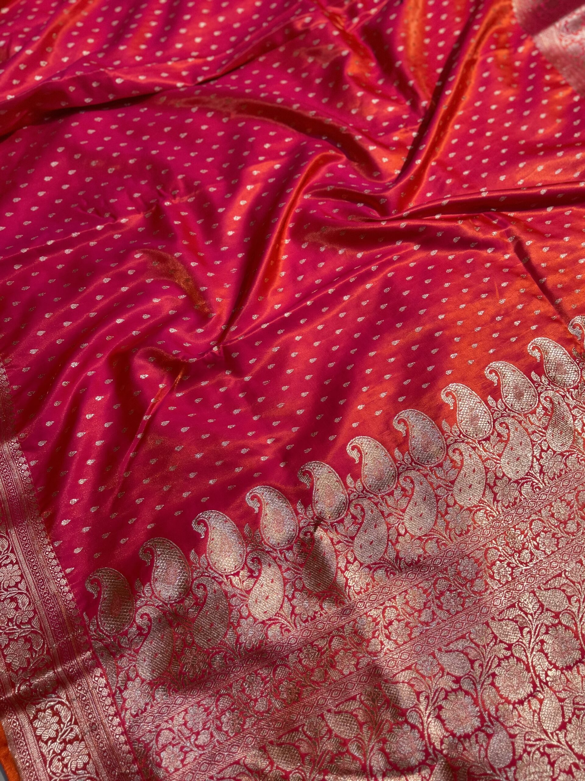 Radiant elegance meets traditional allure in this stunning dual tone Purple-gold Banarasi silk saree with floral motifs and all over buta work.