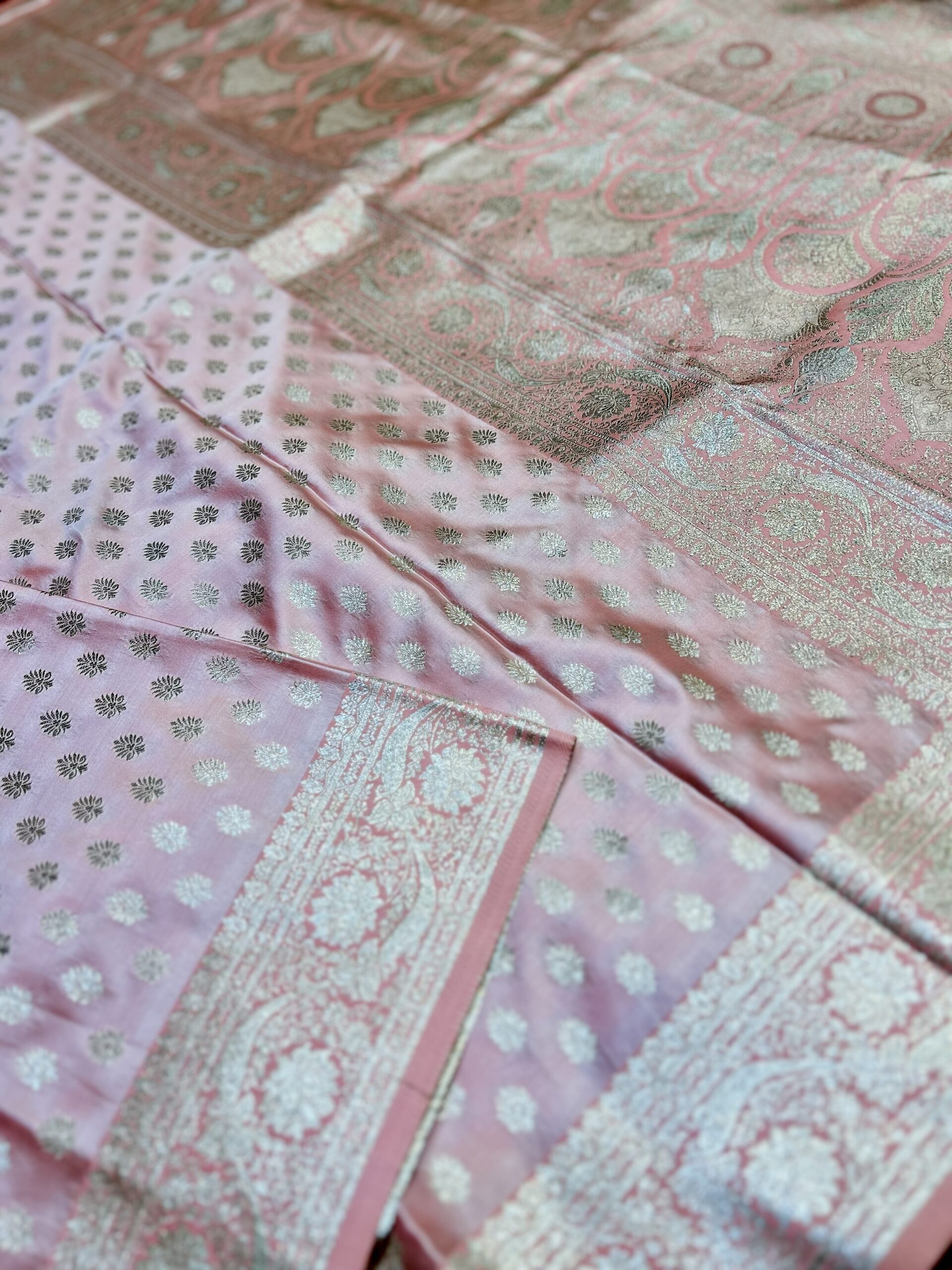 Pista Green Katan Silk saree with silver zari and all over buta work.