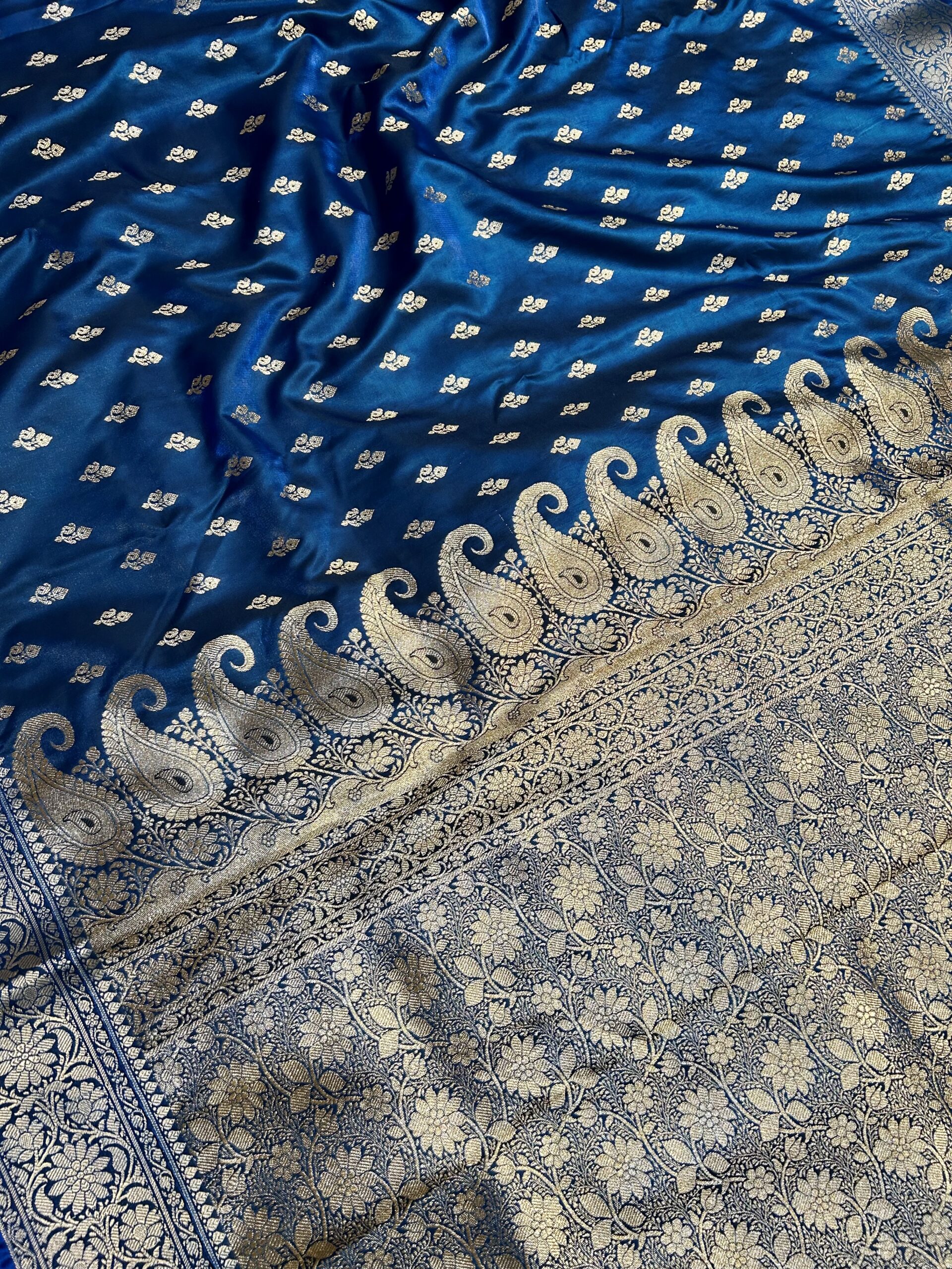 Grey Katan Silk saree with silver zari and all over buta work.